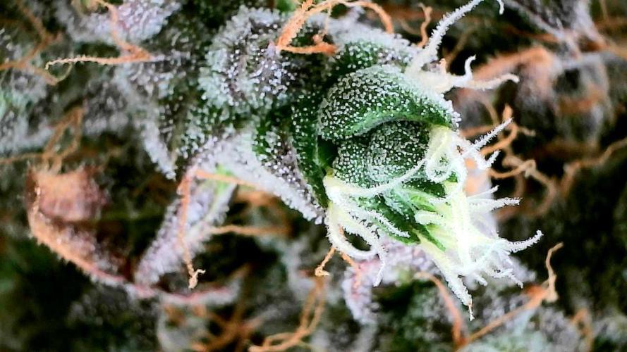 Trichomes are at peak density, mostly cloudy with some amber starting to appear