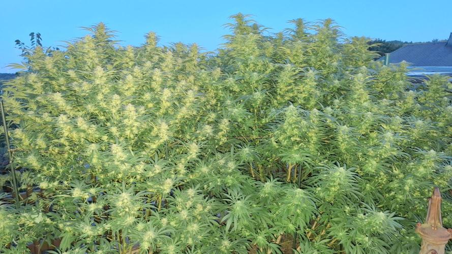 Sie ist mit Abstand die mächtigste dieser 3 Pflanzen, ist aber wie schon erwähnt 2 Wochen nach den anderen erst in die Blüte umgestiegen. Wenn das Wetter noch einigermaßen hält, wird das mit Abstand die massigste von allen. Wenn nicht, müssen wir hoffen, daß wir wenigstens einen Teil retten können. Erntetermin nach breeder wäre da der 28.10, was hierzulande bei dem Wetter extrem kritisch werden kann.