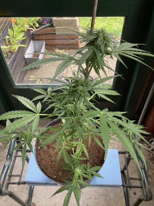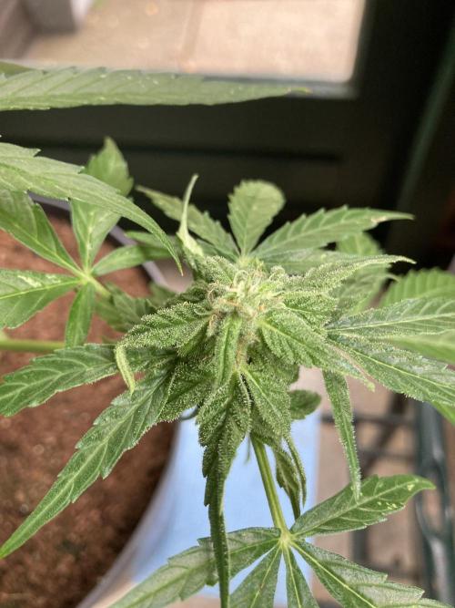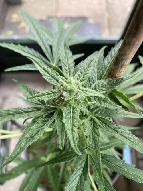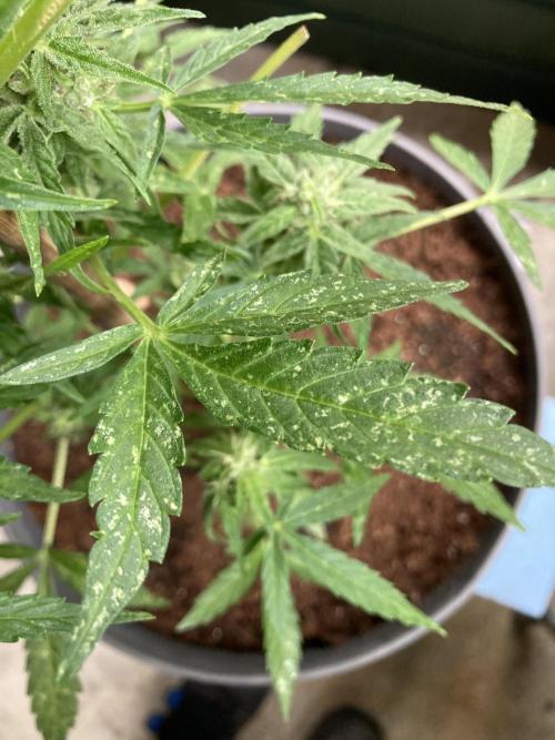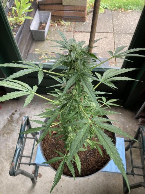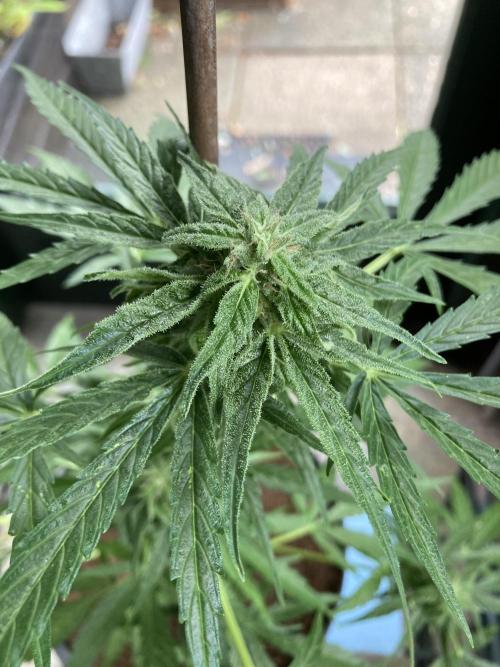 Milky Way F1 has been growing for 63 days now. She doesn’t look really spectacular. The buds are still small. Something has happened to her leaves. I don’t know if its (false) mildew, thrips or sunburn because I sprayed the plant with Cannacure on a sunny day.
