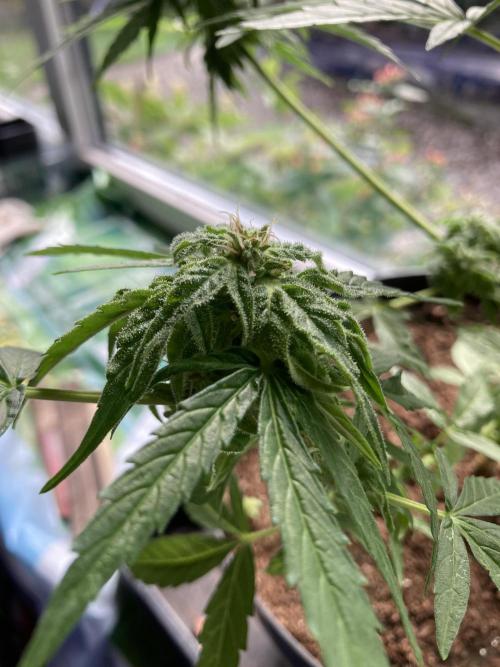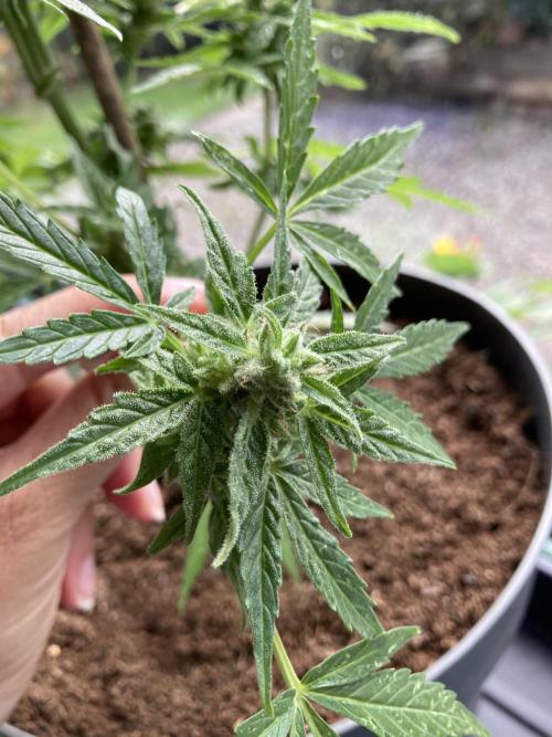 Milky Way F1 has been growing for 63 days now. She doesn’t look really spectacular. The buds are still small. Something has happened to her leaves. I don’t know if its (false) mildew, thrips or sunburn because I sprayed the plant with Cannacure on a sunny day.