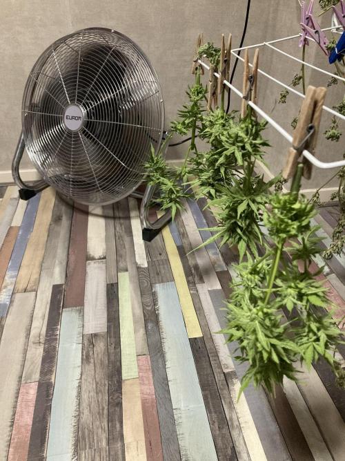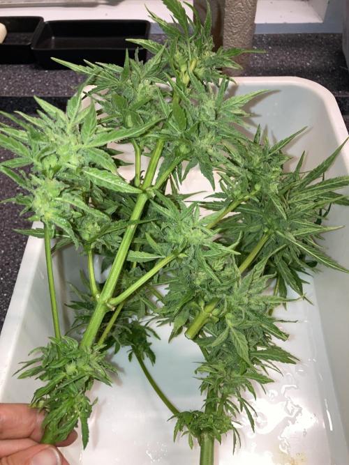 Today I harvested my last two plants, MilkyWay F1. I harvested early because of bud rot. The trichomes were clear and milky, no amber. I cut the large fanleaves off and washed the plants. After that I hung them to dry with the others.