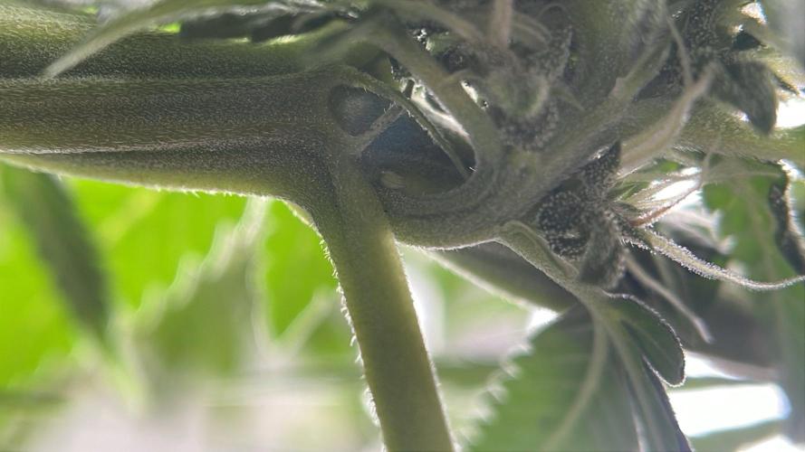 Late-breaking development: after careful searching, I found what I believe are two male flowers on Duckfoot, see last pics. I knew this was a possibility with bag seed, but still don't love seeing it. I'm pretty sure after dissecting it, these are not nanners, but fully developed male flowers appearing at the internode below the female flowers - a true herm rather than stress-induced herming.