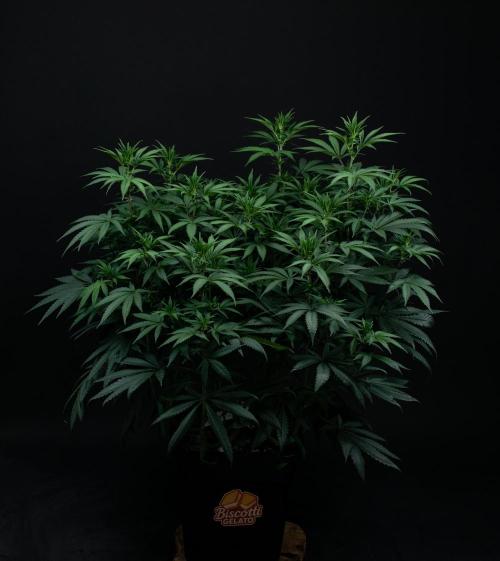 🔸 Growth & structure: Biscotti Gelato is loving life this week. She’s sitting low and proud with a tidy, pancake-flat canopy—tops marching in perfect formation. The main stem is chunky with neat training “knuckles,” and the undercarriage is clean so light and air glide right through. Leaves are a deep, happy green and holding that cute “hands-up” pray—no burns, no drama.
