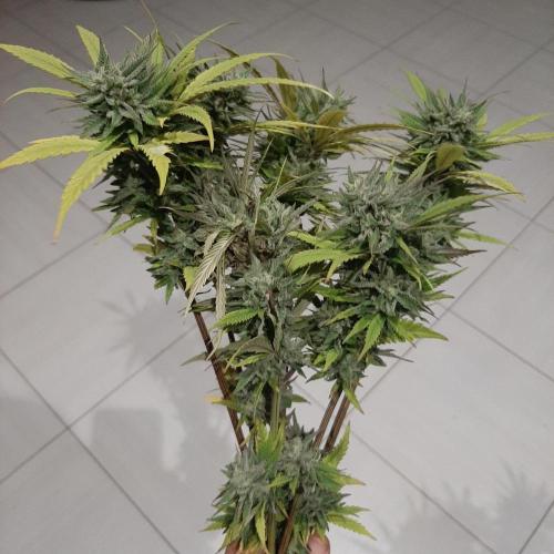 MisterZ Bonjour les amis. Encore une bonne semaine de développement les fleurs gonflent et se chargent de résine 😍. Je la rentre tous les soirs dans la serre pour éviter l'humidité. Beaucoup de manutention et pour l'instant ni insectes ni moisissures . L'odeur reste faible et très douce. J'ai déjà enlevé beaucoup de feuilles flétries. Je viens d'arrêter les engrais mais il me semble qu'il faudra plus de semaines. Bon je verrai bien. 😳. M.
