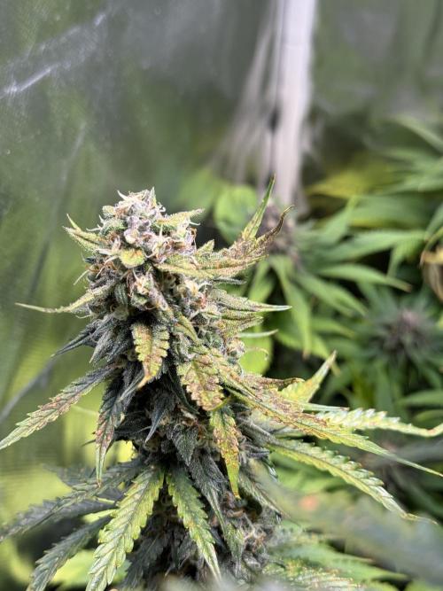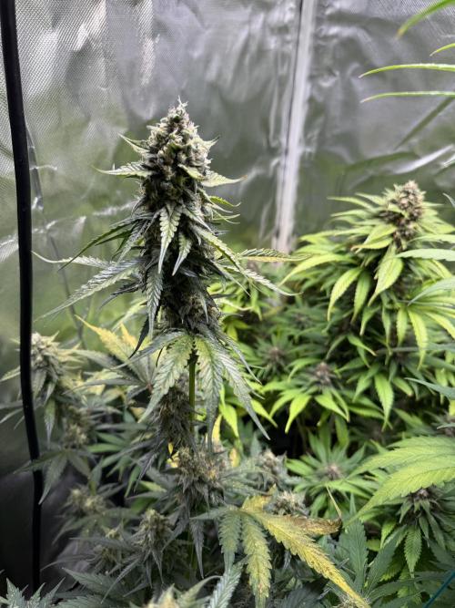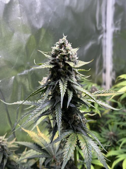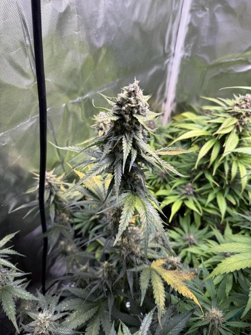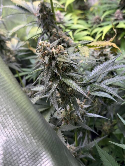 Nocone_Purple The Blueberry is showing long, spear-shaped colas that are filling out steadily. Compared to the Blackberry, it’s a bit behind in density, but that’s expected for this strain. Trichome coverage is starting to increase and the tops are showing healthy growth. Some lower leaves show light signs of fading, which i think is normal as the plant shifts energy into flower production.