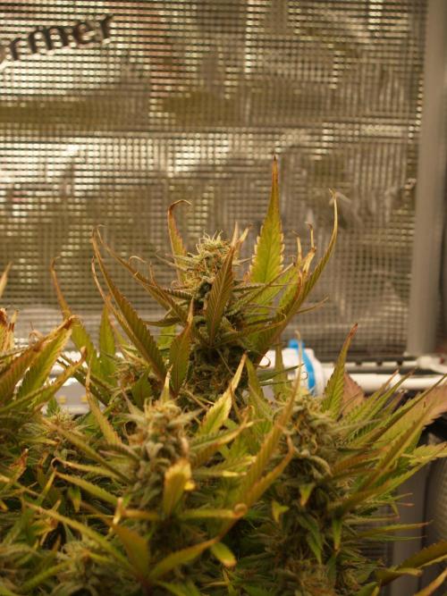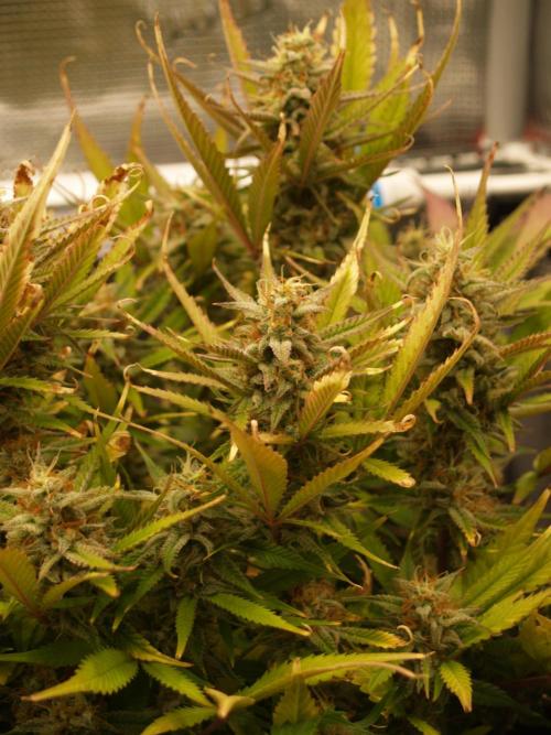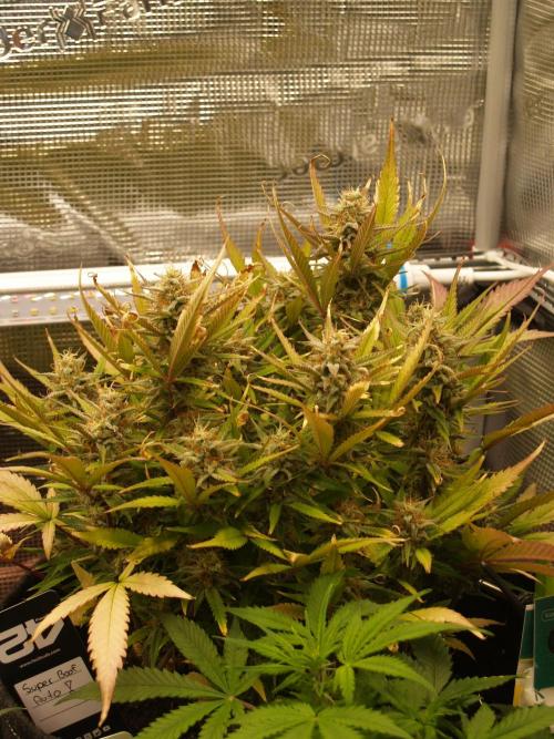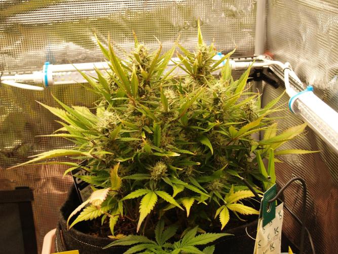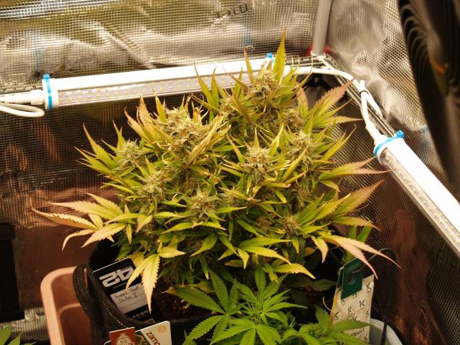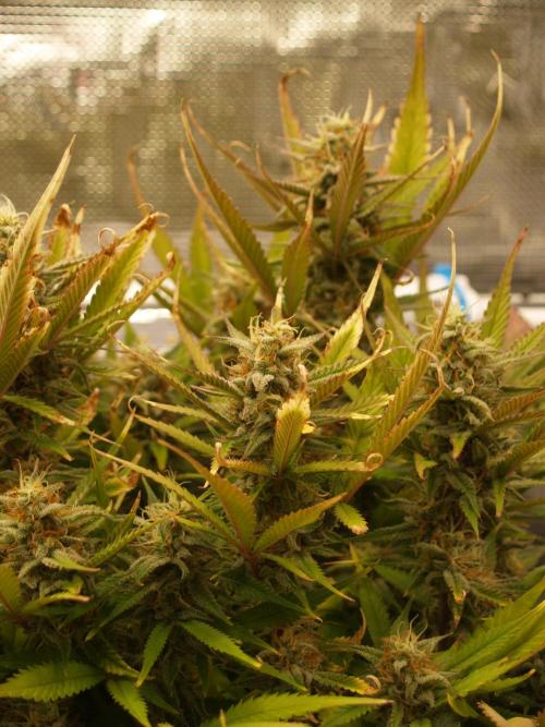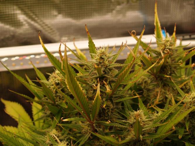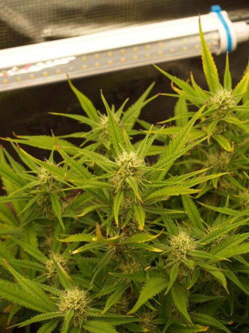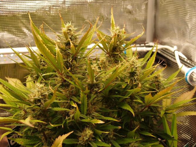 -Tag 54 es sieht so aus als hätte sie Stickstoff Mangel oder Hitze Stress wegen den Gelben Blätter und Hochstehende Blätter sind uns aber noch nicht ganz sicher. Wir haben den PH und EC Wert des Runoff kontrolliert und da scheint alles in Ordnung zu sein