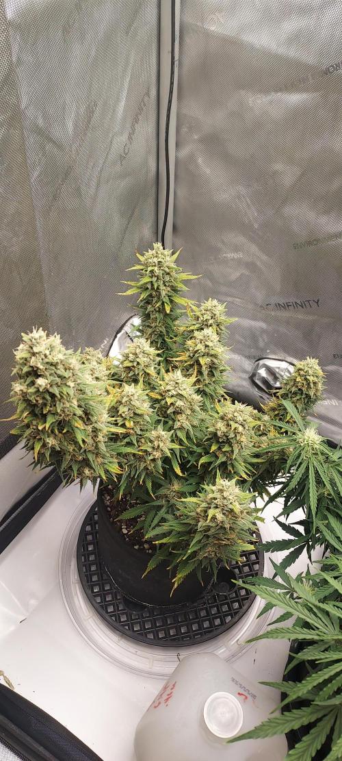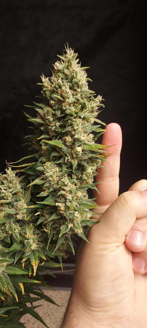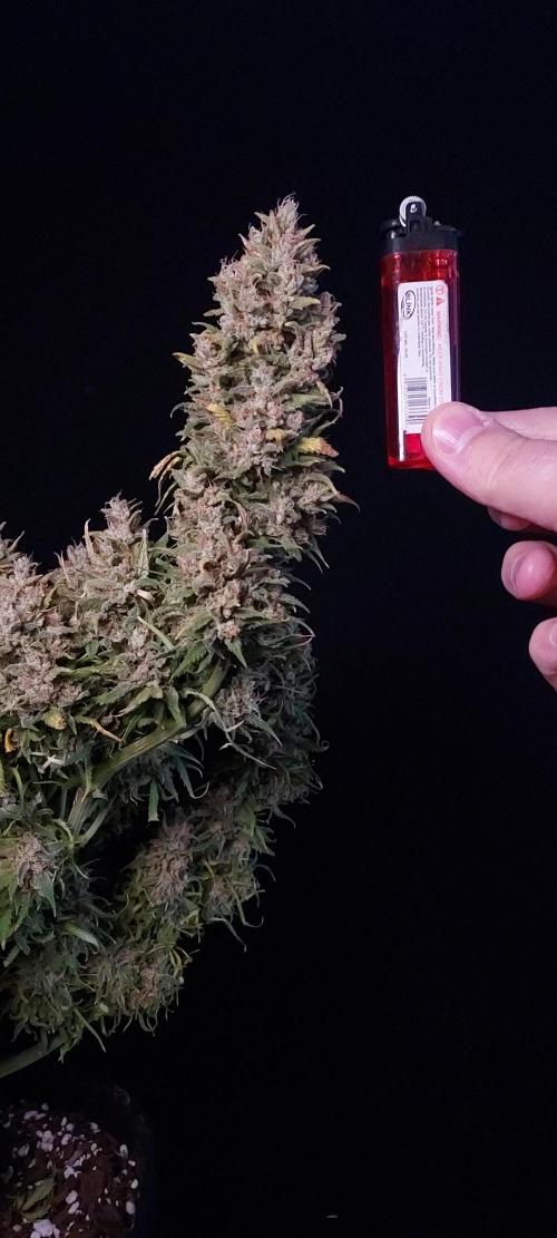 Her main cola is pushing the length of three lighters long, and a bit of training produced several colas of the same size. I am hoping for a size yield after a good dry. I'll be doing a few days of a whole plant dry but might need to break her down just to dry her a bit faster given the size of those colas ha!