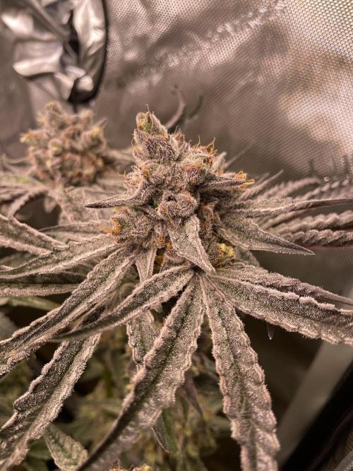 Die Yuzu Burn ist extrem frostig. Selbst die großen Blätter sind mit Trichomen überzogen, sieht schon fast surreal aus. Der Name ist Programm: Sie riecht tatsächlich nach Yuzu, also nach einer Mischung aus Zitrone, Orange und Mandarine. Am Anfang war sie die langsamste im Wachstum und jetzt ist sie die größte im Zelt …