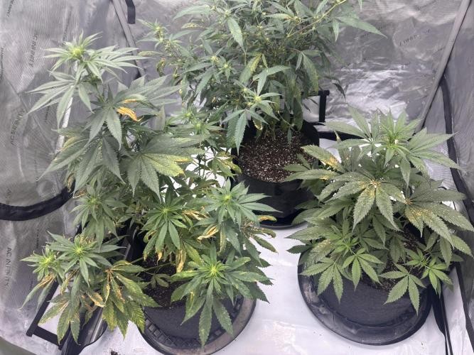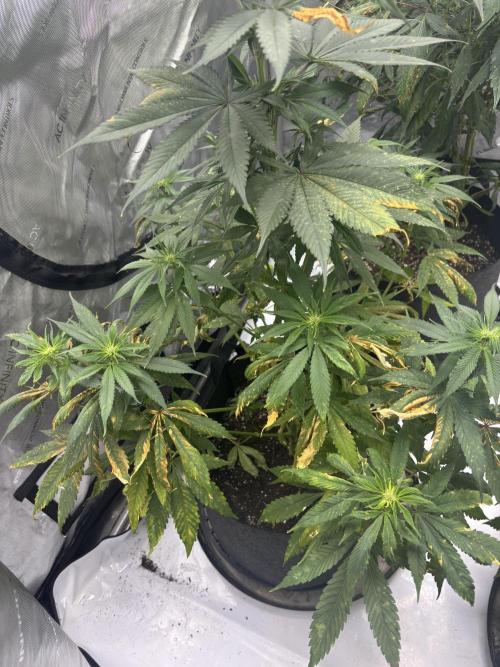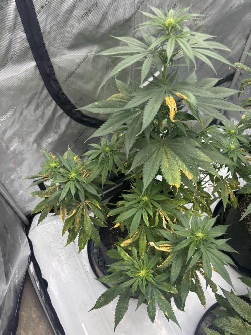 lov3m3mor3 First photo: Nuclear forest on the front left, Dirty Mimosa on the front right, pine tree kush JR. in the back middle. This was a stressful week for the girls. I bottom watered and shortly afterwards the bronze patches started appearing. I think that’s a deficiency related to using garden lime as a ph balancer, and not burn. Also the DIY fungicide made the mildew spread. Never doing that again.