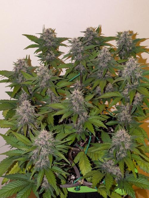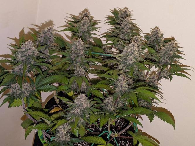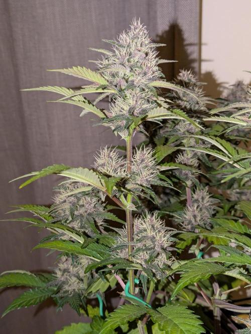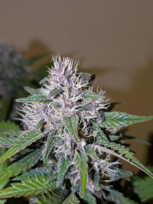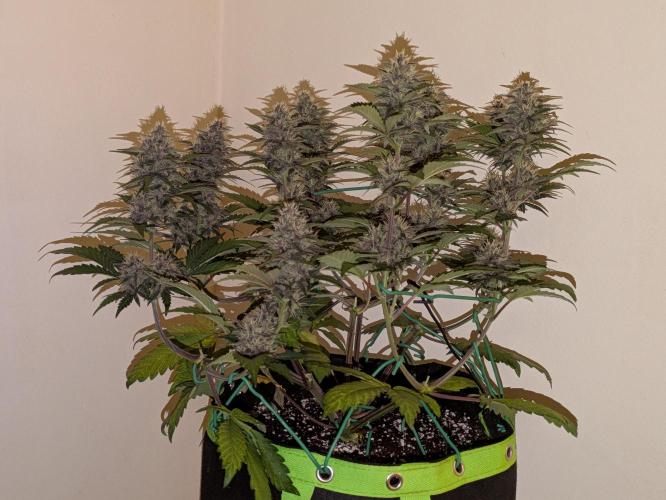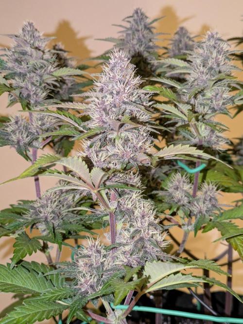 Gorillanonymous Day 37 - She's continuing to grow like a beast. I'm really happy with the canopy shape, it's ended up flat and I feel like these buds are going to get huge! The calyxes are totally purple, and under the grow lights you can see the dark anthocyanin lining the edges of the leaves as well.. she's a purple phenotype for sure ..