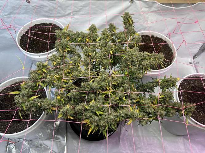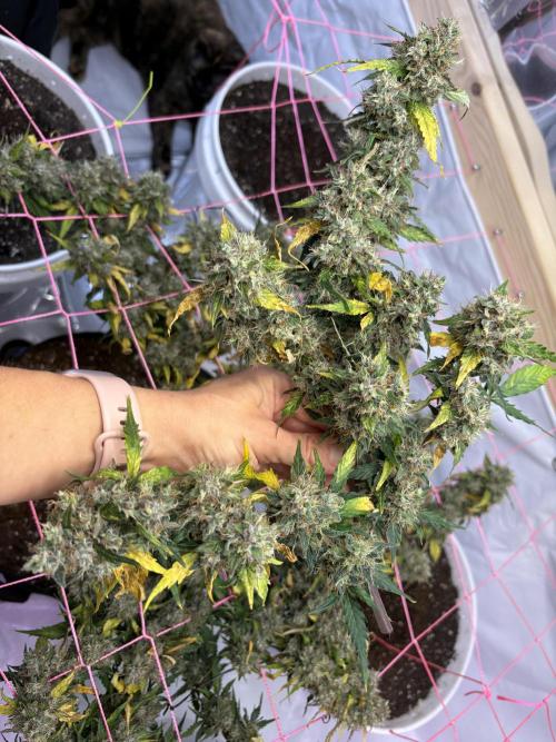 Plant C is a littler further behind and showing some yellowing leaves. I’m adjusting the nutrients to see if that helps. Starting the flush on Plants B & D in anticipation for harvest soon!