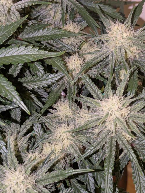 Gorillanonymous Day 46 - She looks super happy, resin production is starting to ramp up, smells real gassy. The scent of 7up is distinct after touching a leaf it's pretty remarkable! She's getting too bushy so I gave her a major defoliation, to allow more light to reach the inner buds, and to improve airflow.