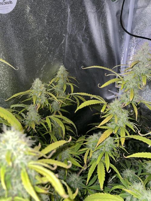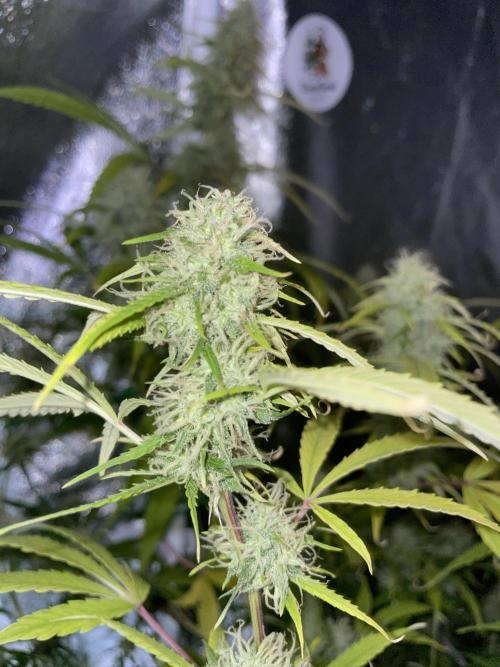 Quick update on Black Opium! Reached unexpected heights with branches exceeding 50cm in length. Running a bit behind her tent mates but now bulking up nicely - the buds are doing excellent work despite inevitable light stress. For an 8L pot she’s absolutely massive! Takes up way more space than expected. Definitely keeping that in mind for the next Black Opium seed - this strain needs serious real estate!