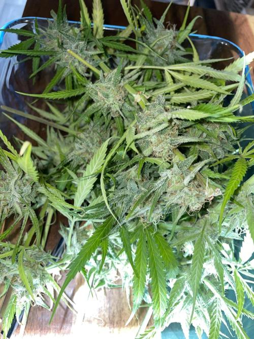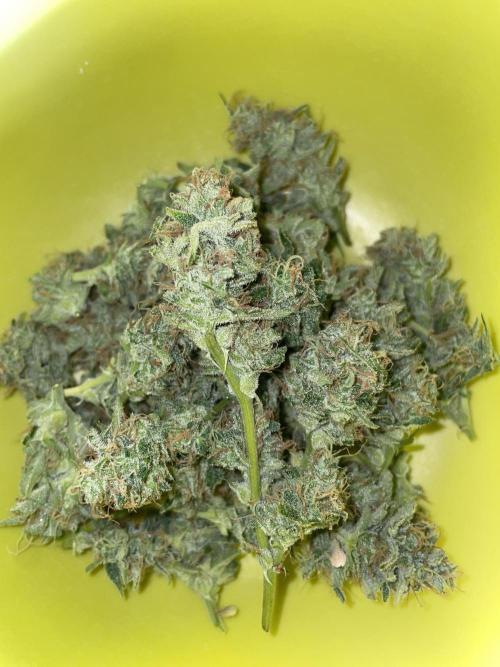Covered in trichomes from top to bottom. Frosty, sticky, perfect for flower or hash production.
