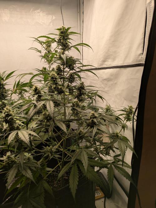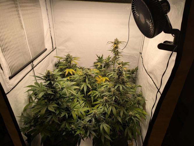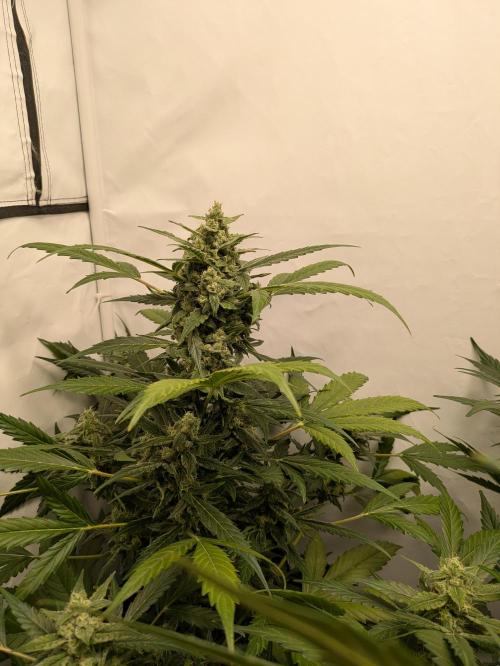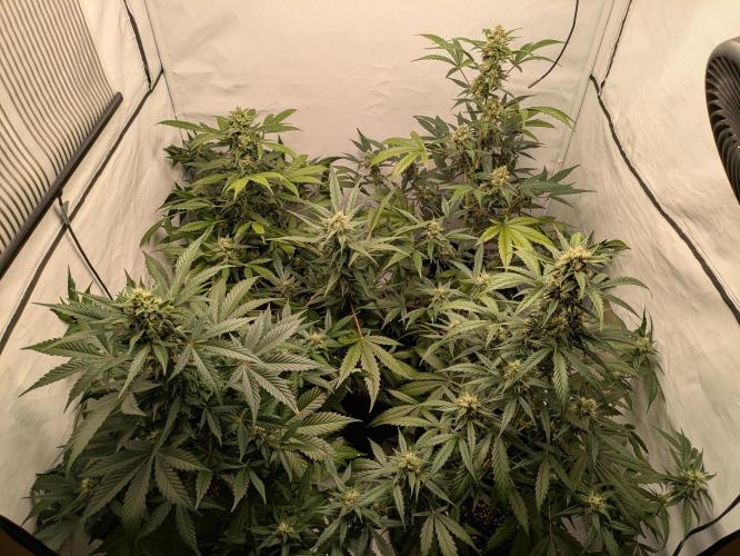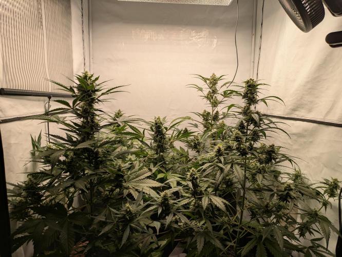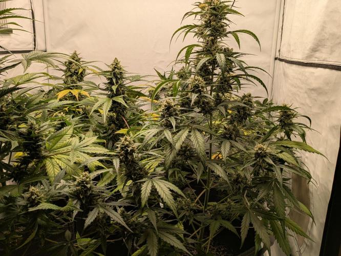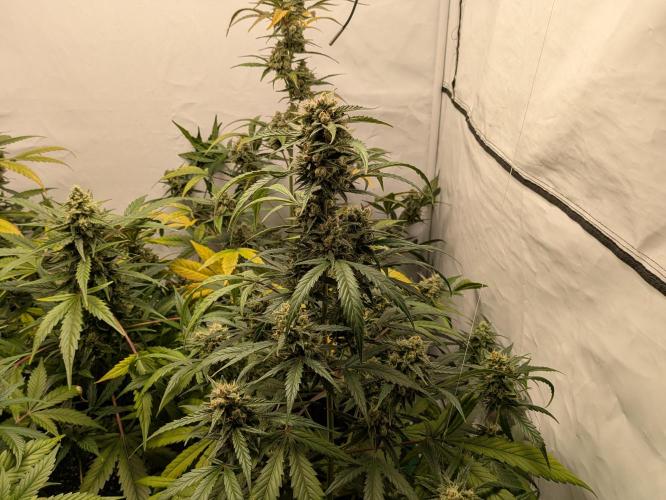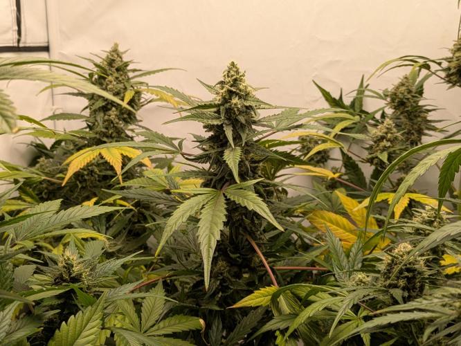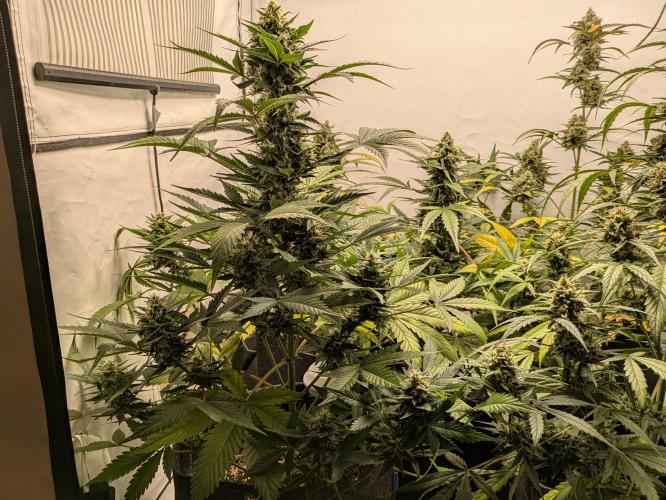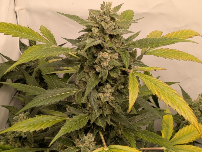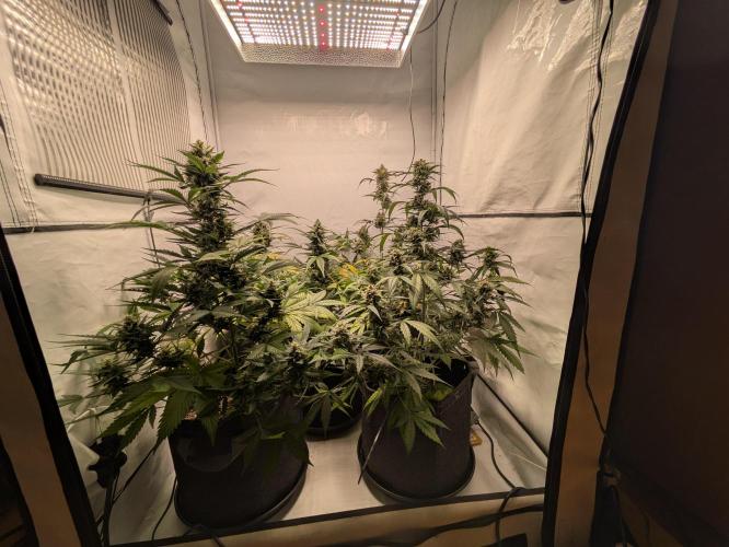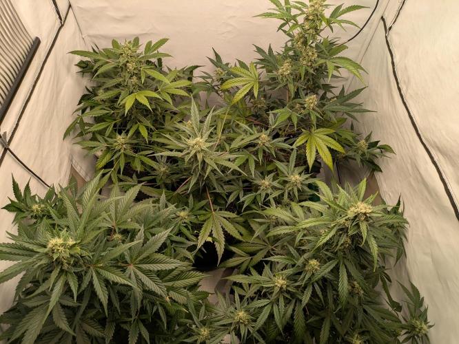 Die Pflanzen wirken vital. Eine der AKs wäre rein optisch erntereif, verarbeitet aber noch Wasser. Da im gleichen Zelt auch getrocknet wird, bietet es sich ohnehin an, die Ernte gemeinsam mit den anderen zu machen. Besonders eine der Sour Diesels fällt heraus: sie präsentiert sich klar als die stärkste Pflanze des Runs.