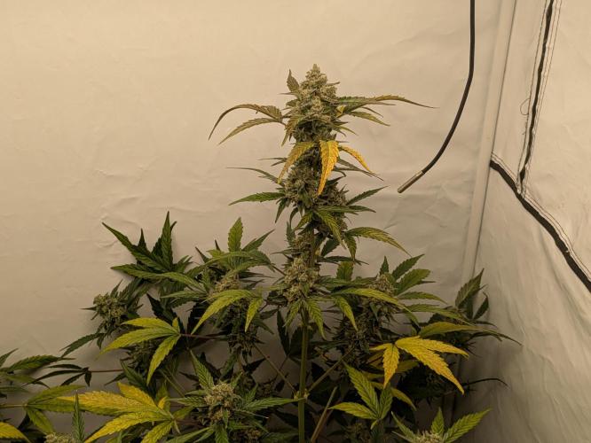 Vermutlich wurde die Lichtleistung anfangs etwas zu langsam gesteigert oder die Pflanzen hatten durch andere Faktoren leichten Stress. Eine Sour Diesel ist dadurch stark in die Höhe geschossen, mit längeren Internodien als gewünscht.