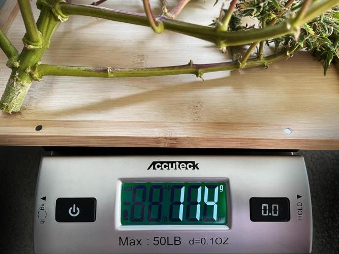 drakkon I harvested the Gaia F1 on day 77. Putting the whole plant on the scale, it was 114 grams. That's a little small for my liking, but I realize this grow has been nowhere near perfect, so I'll gladly take it and I look forward to the eventual smoke. The plant did well despite the adversity and it smells really nice.