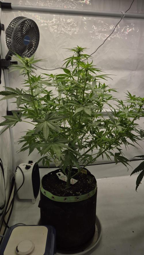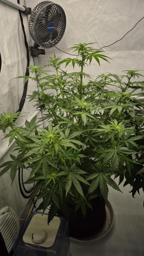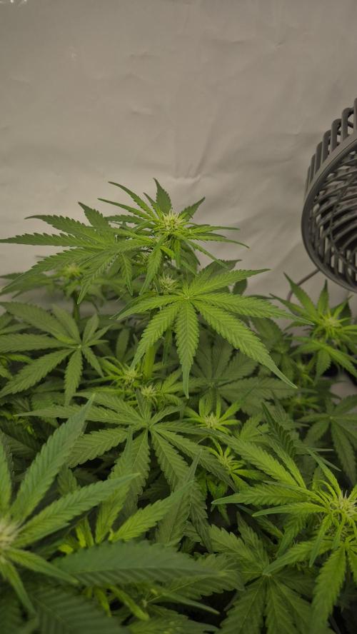 Die Pflanze streckt sich und entwickelt Blütenstände. Der DLI wurde sukzessive auf 40-45 angehoben. Der Düngeplan wird auf Blüte umgestellt. Je nach Bedarf gibt es zum Hesi -Boost und dem Cal-mag mal Silica Force (enthält zur Kieselsäure auch Kalium) zusammen mit Hesi pH- (Phosphorsäure) um den phWert anzupassen (6,3), oder Hesi Boost.