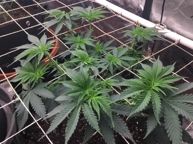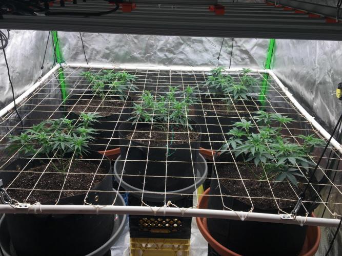 Dropped the scrog. Started to weave a little bit. Some light defoliation and lollipopping. Have not seen much stretch this week, just sending energy to getting thicker. I have been feeding 2 gallons every other day but they have been dry by feed time. Dropped in 4 gal the other day and will do 3 gal every other day moving forward, see how things keep up. Part of switching to dirt was supposed to be less feeding though so I might up it to 4 gal.
