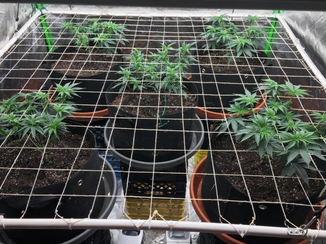 The transplant meant the milk crate stack was lowered and the other grow had to move I am going to start a new journal for the Galactic Wedding. It is more of a "fun" grow though. The girls need a big defoliation this week. Just letting them adjust after transplant. I break up the roots and use a lot of myco, shock isn't usually an issue. I got my tent frame/trellis net weaved today but I won't install it until at least next week. Trying some new things with it, already planning a big re-design next grow.