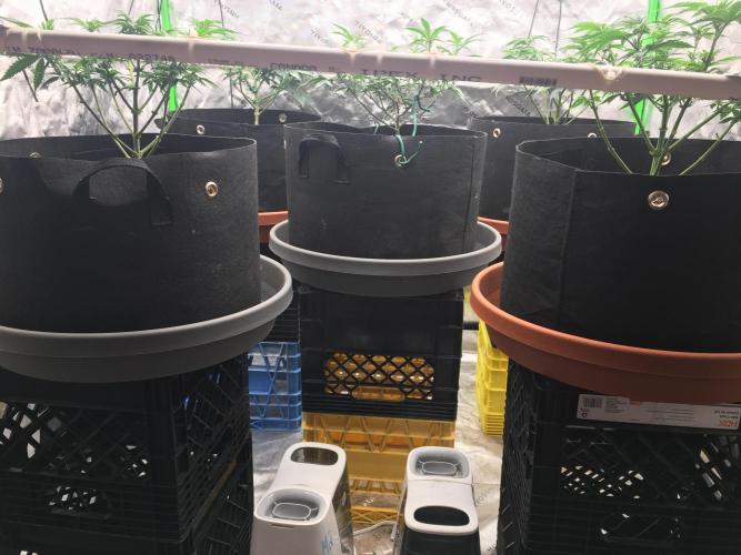 Ladies are healthy. Still might have a little nitro deficiency on the WW but the Ricky's is looking green all around. The bloodmeal is working well, doesn't smell great though. Did our nematode follow up so they've had a little too much water. No sign of fungal gnats remains (I hope...). The girls got moved into their final 10-gal pots. Got some new large pot bases to accommodate them and allow for bottom-feeding (stupid expensive @ ~). They probably could have been transplanted sooner, to be honest. I did not water after transplant because they're plenty wet.