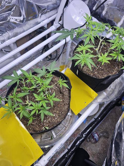 They popped fast- I'll let them get lanky then I'll train. Aiming to start flower around week 9. I'll add humidity around week 7 and let them start growing out for real. Still only 8 tops- next time will be half of each plant and we will see if they survive.