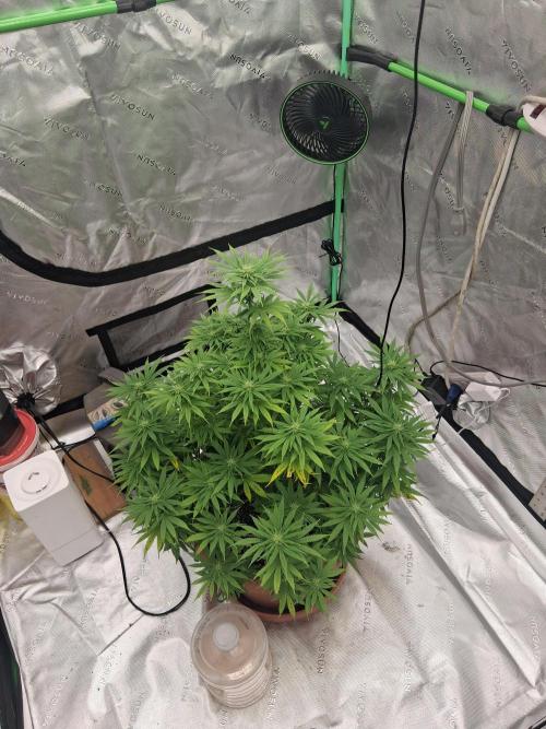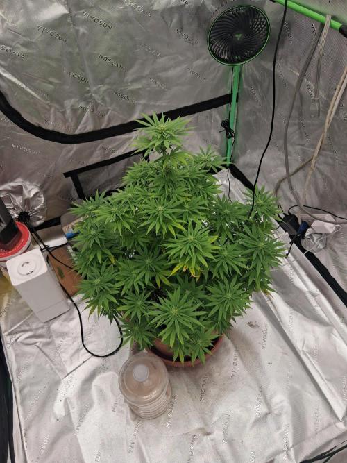 DoobieDoobieDan Not much vertical growth, but flowers are getting bigger. Very slight smell starting. I think topping stunted height growth, but with the bud trainer clips plant has widened a good bit. Lots of bud sites all looking good. I tuck leaves as much as possible before I defoliate as necessary. I won't be starting autoflowers in small jiffy pots as I think it also added to the stunted height. I started The Green Crack directly in its final 5gal pot and its looking good, I'm not gonna top it, just to see what happens since both strains have similar size claims by . PH is at about 700 ppfd and GC is at 420ppfd. The single light above GC is higher up than the two over PH and has a separate controller still set to the veg setting the 2 over PH are in flower setting. All 3 lights are 1 setting down from max. I have 3 fans on oscillation 2 blow on canopies 1 blows on soil/under canopy and a small humidifier that comes on if humidity drops below 60%RH. I also have a small swamp cooler if I need to lower temp and raise humidity. All in all they are doing well. Added pics of 1 of my outdoor plants. I think I over fed Nitrogen but its starting to flower nicely albeit a little leafy, just hope it finishes before the nights here in the NE US get too cold.