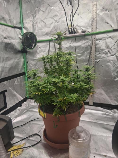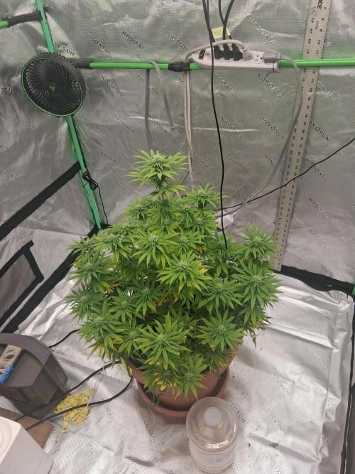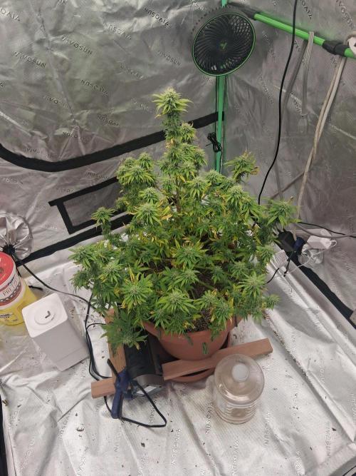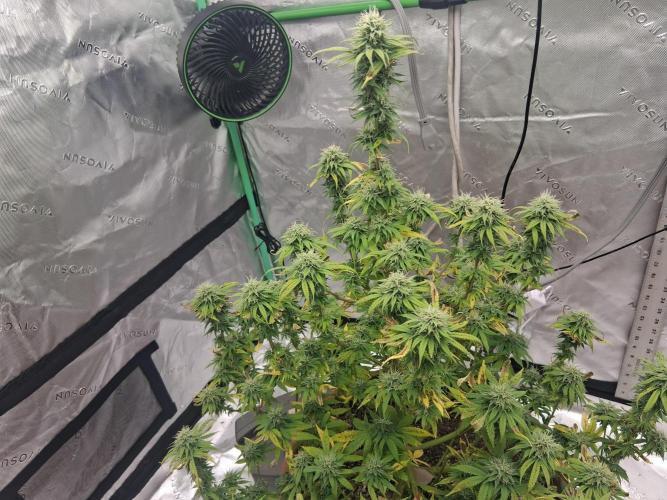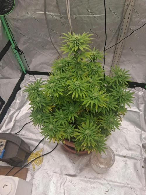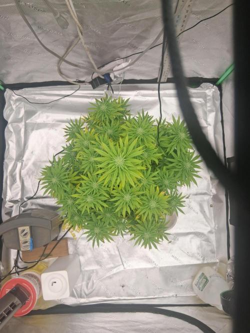 DoobieDoobieDan She's looking good, flowering nicely. I am gonna defoliate the leaves ready to fall off as she sheds her unnecessary leaves. 4x4 tent with 2 of my 3 200w led's at full power. My phone app says around 700ppfd just above top. I am also seeing the little extra C02 from the yeast and sugar water. I shake it 2-3 times a day. My house is on the cold side right now so the tent only draws a little air from outside the tent. No point adding C02 if air is constantly flowing in and out. I'm just hoping she finishes before my other 4 outgrow the 200w light they are under now.