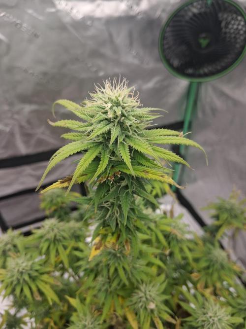 DoobieDoobieDan Not sure the cause of brown spots, i watered with 6.3ph with only cal mag to runoff yesterday, and lowered the lights closer to the manufacturers rec. spots appeared today. On only a couple leaves. I don't know if this is normal for this strain towards end of flower. Going off the Fastbuds claim of 8 weeks it should be done in 8-9 days. Buds are filling in nicely. Green Crack is doing well. No spots on leaves. But for some reason these autoflowers are staying fairly short and bushy. I did a light defoliation on both plants to help with air flow since I'm having higher than normal humidity levels. Waiting for my dehumidifier to get here. Any advice is more than welcome.