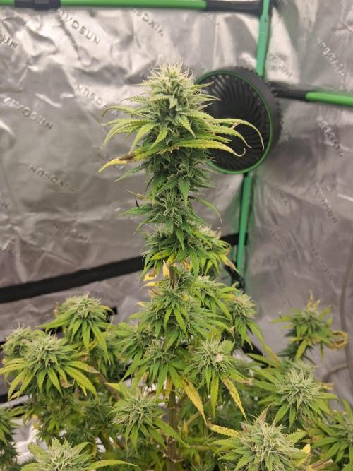 DoobieDoobieDan Not much vertical growth, but flowers are getting bigger. Very slight smell starting. I think topping stunted height growth, but with the bud trainer clips plant has widened a good bit. Lots of bud sites all looking good. I tuck leaves as much as possible before I defoliate as necessary. I won't be starting autoflowers in small jiffy pots as I think it also added to the stunted height. I started The Green Crack directly in its final 5gal pot and its looking good, I'm not gonna top it, just to see what happens since both strains have similar size claims by . PH is at about 700 ppfd and GC is at 420ppfd. The single light above GC is higher up than the two over PH and has a separate controller still set to the veg setting the 2 over PH are in flower setting. All 3 lights are 1 setting down from max. I have 3 fans on oscillation 2 blow on canopies 1 blows on soil/under canopy and a small humidifier that comes on if humidity drops below 60%RH. I also have a small swamp cooler if I need to lower temp and raise humidity. All in all they are doing well. Added pics of 1 of my outdoor plants. I think I over fed Nitrogen but its starting to flower nicely albeit a little leafy, just hope it finishes before the nights here in the NE US get too cold.