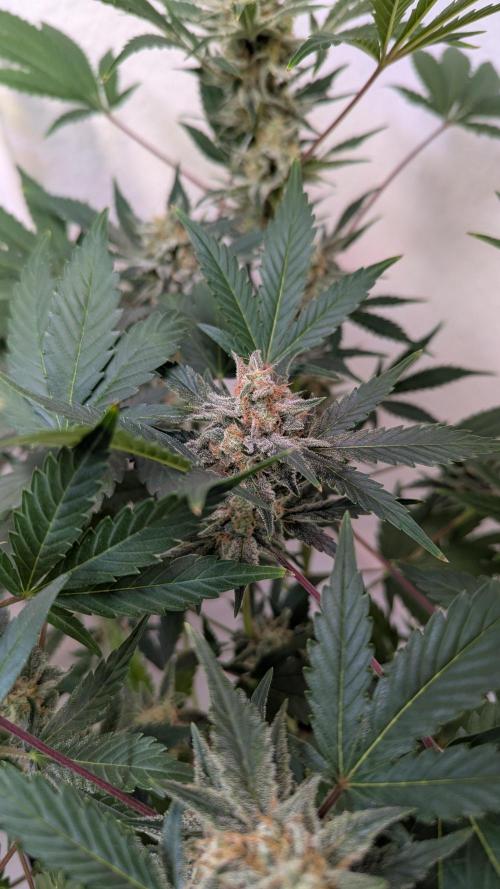 Her leafs are still pretty dark green, which I think can be called a Nitrogen hangover from a little excess in veg. It doesn't appear to be problematic, her buds bulk up nicely and her trichome production as well as the aroma are pretty strong.