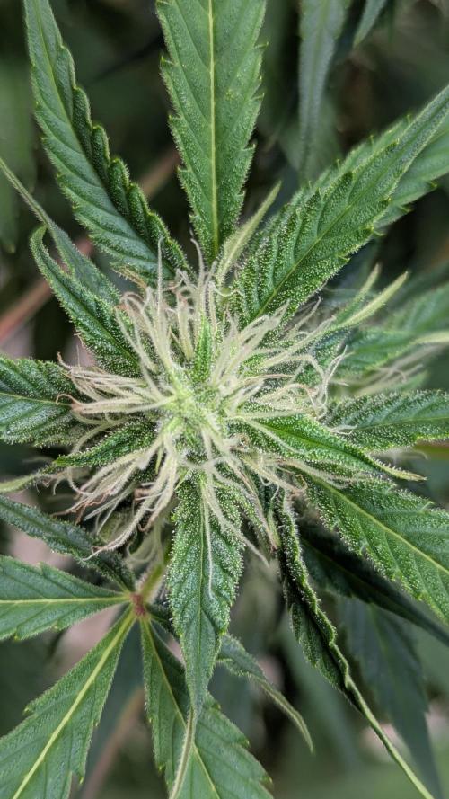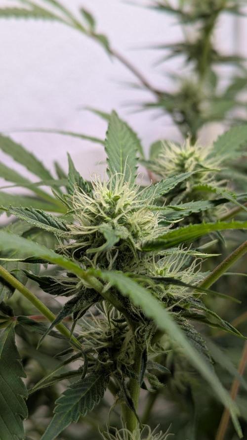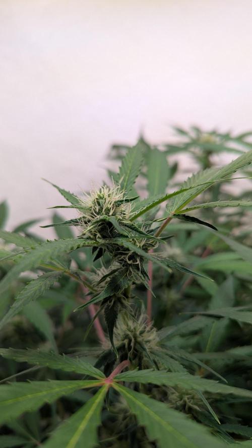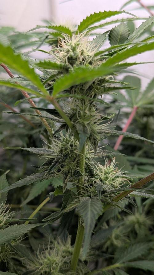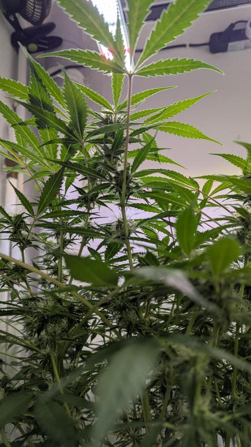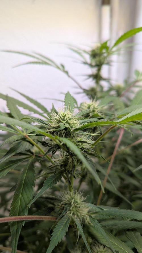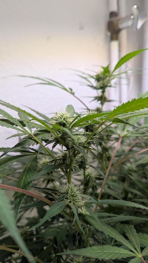 Aircoholic She's slowly waking up now, and starting to stretch. She's looking super healthy and showing lots of vital growth. Her flowers start forming, not bulking yet, but already pretty to look at. I'll do some light defoliation and lollipopping this week to give her some space and improve air circulation.