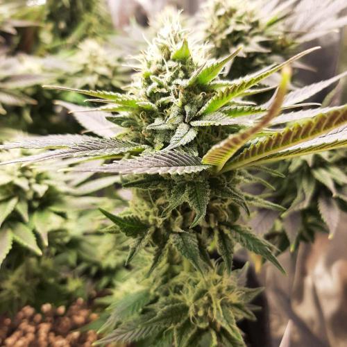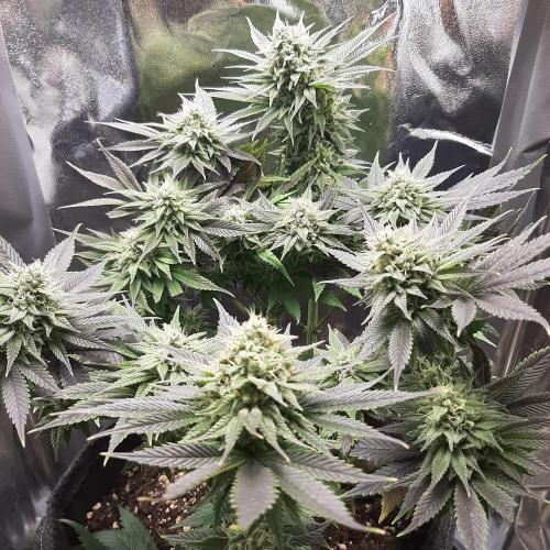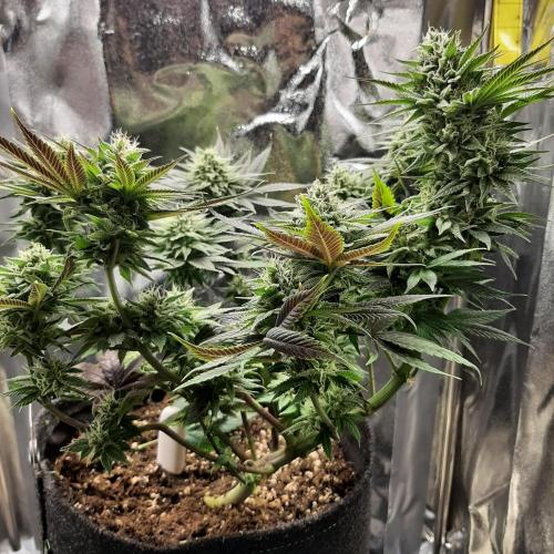 MisterZ Bonjour les amis. Les feuilles ont pris une couleur très sombre presque noire. C'est la première fois que j'obtiens ça. Je pense qu'elle est sensible à la température de 15°C quand la lumière est éteinte dans mon garage. Je l'ai rentrée dans une petite tente pour qu'elle soit dans de meilleures conditions. Le stretch a repris et les fleurs se développent. J'ai libéré la plante de tous ses clips. Ça se passe plutôt bien. L'odeur est très faible. À bientôt, M.