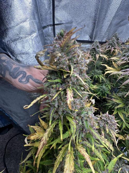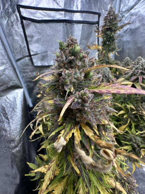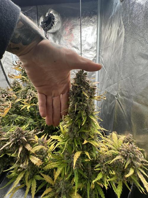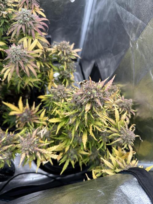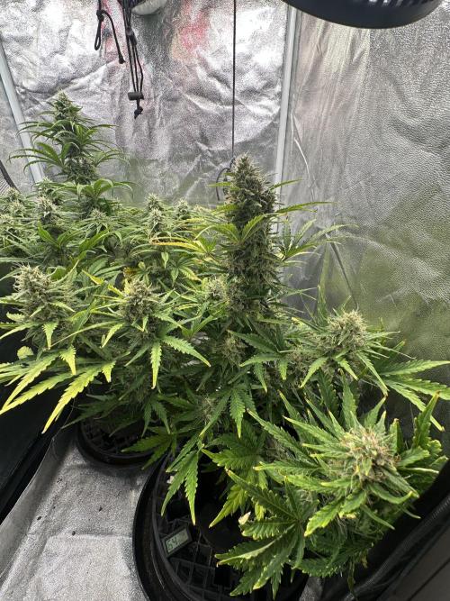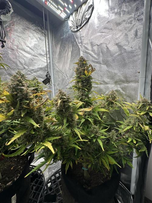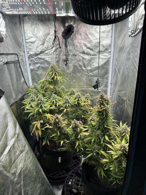 InsideAz Week 8: (9/17-9/24) Forgot to get pictures this weje They’re starting to smell this week a stanky dank sweetness wafting out of their small 2x2 tent. The (what in assuming) nitrogen deficiency progresses this week. Another problem I realized was really bad airflow on the bottom sides of the plants, a small floor fan was installed. After giving teas almost back to back weeks I’m done providing nutrients, they look deficient but should have enough to push through the end of flower and flush nicely. Just watering the next couple weeks as the buds thicken and create frost. Light intensity will stay about 80% roughly 12 inches from the top of the plants Will probably drop the light schedule to 18/4 next week to reduce potential light stress and correlate with my other grow tent in the same room (being effected by the light)
