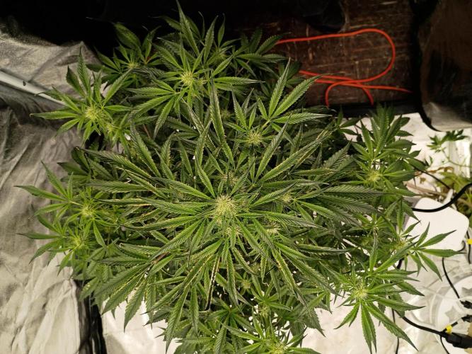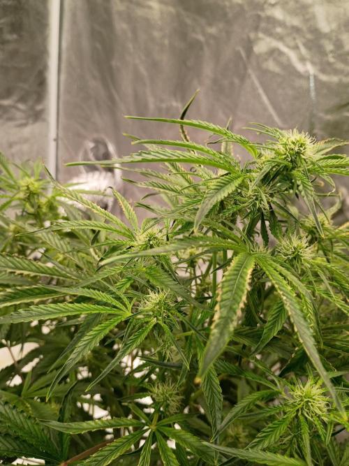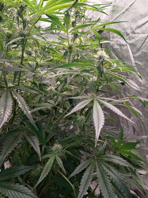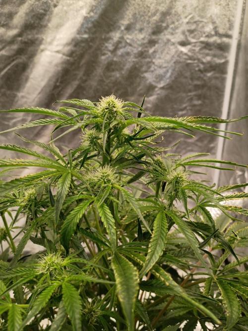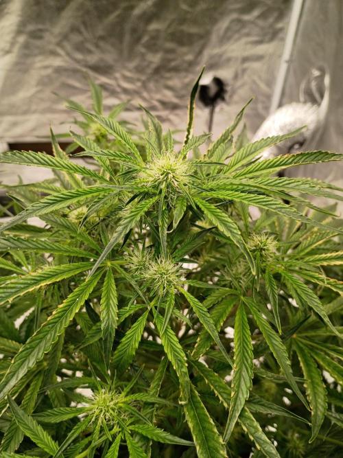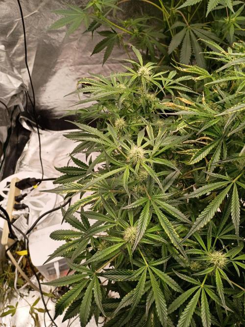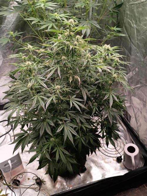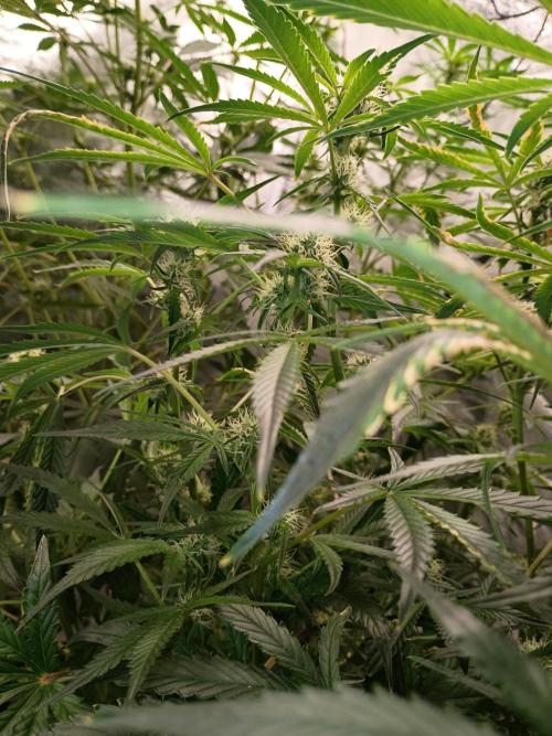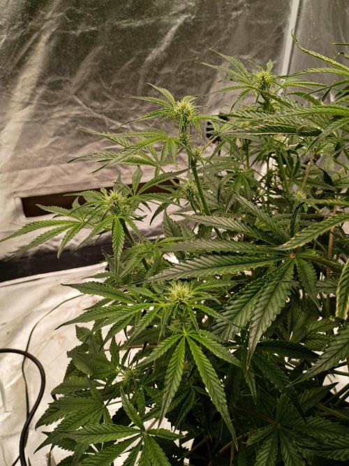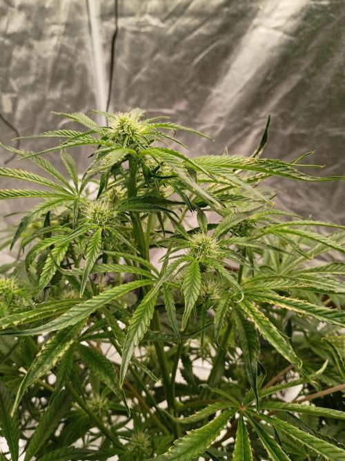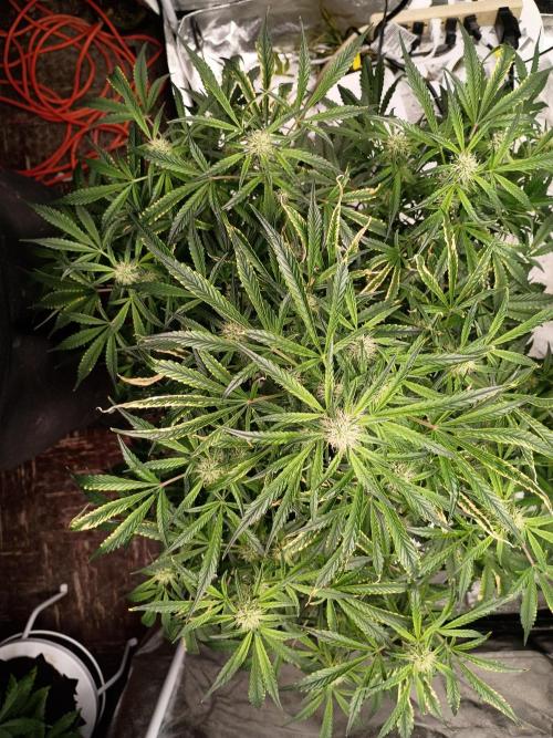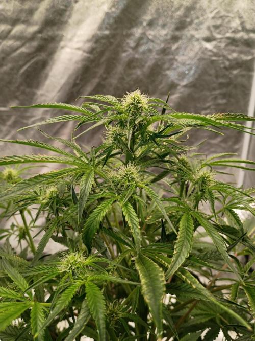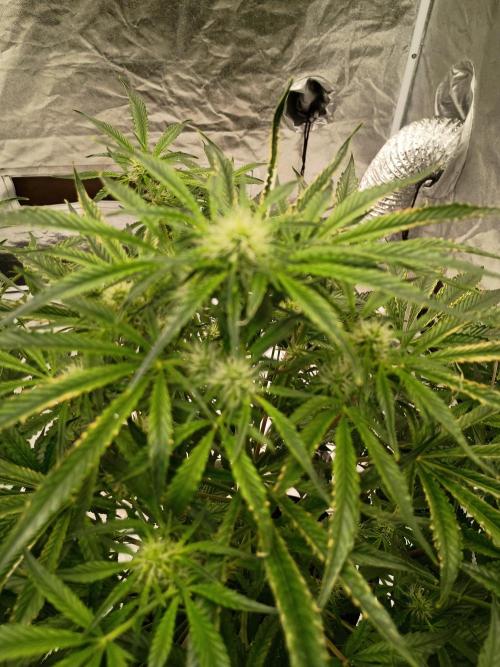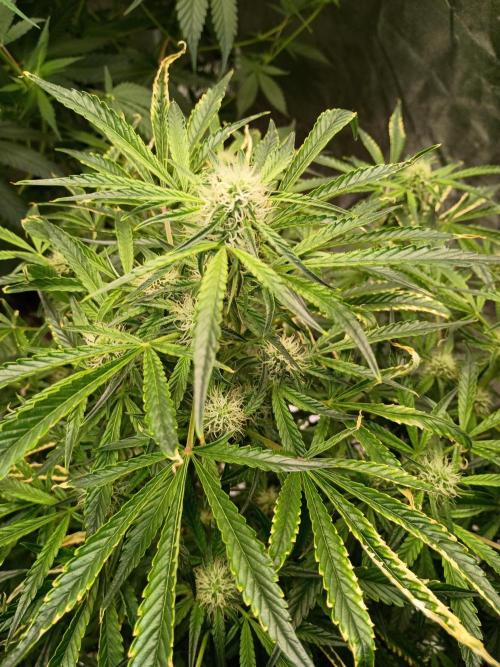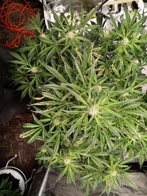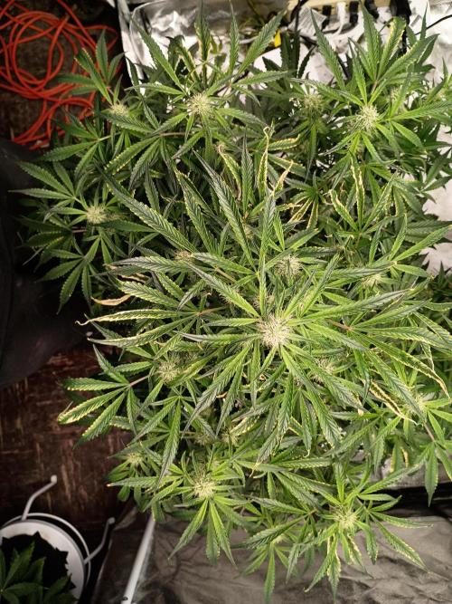 Mrdub She is taking her time prob cause she's been shocked a few times but def bouncing back crown is starting to develop really nicely lots of bud sights nice thick stalk and stems short and bushy prob gotta little bit more of a stretch so hopefully another 4 weeks and she will be ready she gotta nice 1ftx1ft width been tucking leaves to get more light exposure