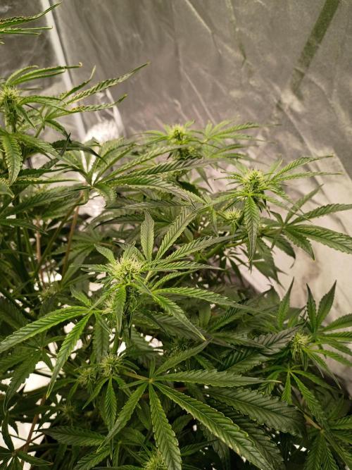 Mrdub This girl is takin her sweet time she doesn't like heat I found that out so far but she has lots of bud sights pistols starting to change trichomes getting heavier got a lil smell to her nice short bushy indica and she nots stretching that much but got some nice width to her 28x24 so her to another week of growth