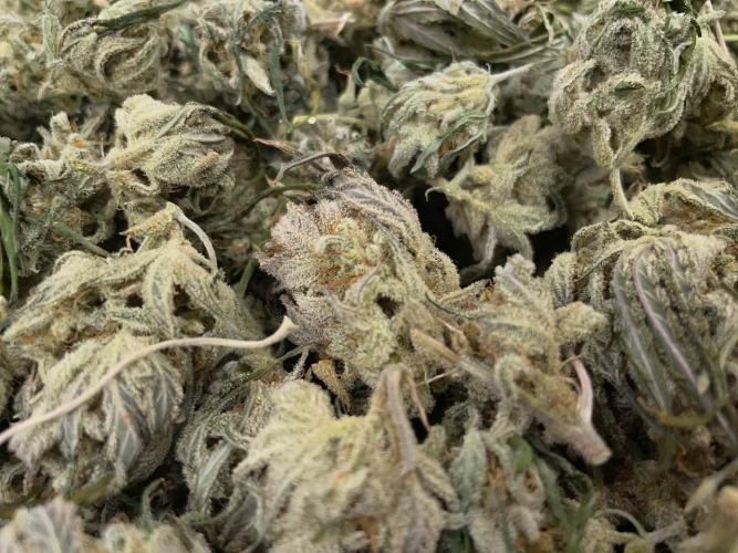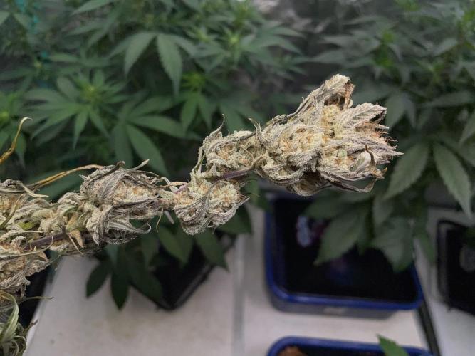 Big surprise of the grow is the White Widow CBD in the mini pyramid, it has the largest developed buds of the lot, very strong limonene terps, smells delicious, and looks like a reasonable result from a tiny plug.
