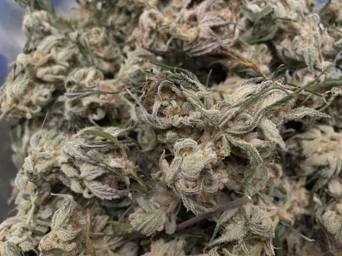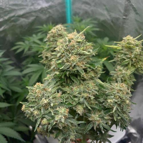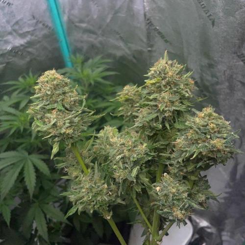 EazyRider Two SMQR's have put on some stretch to a decent size and plenty of trichomes on the sugar leaves, still very curious what Mango Isle is going to do seeing as she is so different from my first ones. CBD weed in a mini pyramid is looking pretty good biggest buds of all the plants so far! I have been removing leaves continually and opening them out but they still seem pretty crowded as I have not done much pruning. I will continue to gradually pull them apart as the leaves die off.