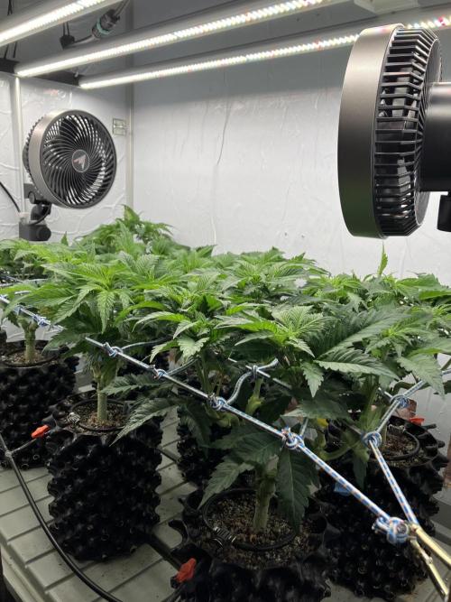 loomerlope Plants have a calcium deficiency, spraying CalMag twice a day right now and will increase usage of CalMag to 2ml/l in the solution. Also started training on all plants and removed the first pair of side shoots on each new top. Probably 1-2 days to next topping, to have 4 main branches on each plant. DLI is about 25.