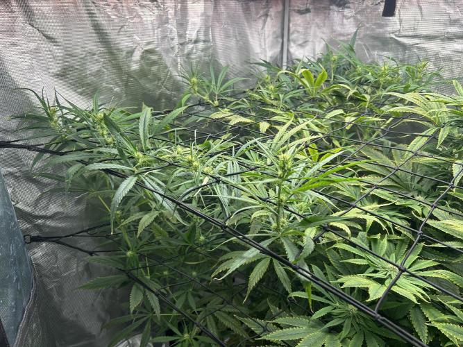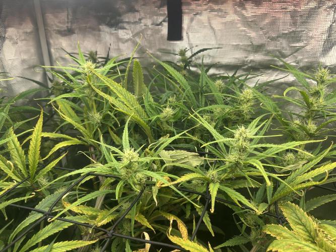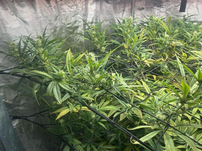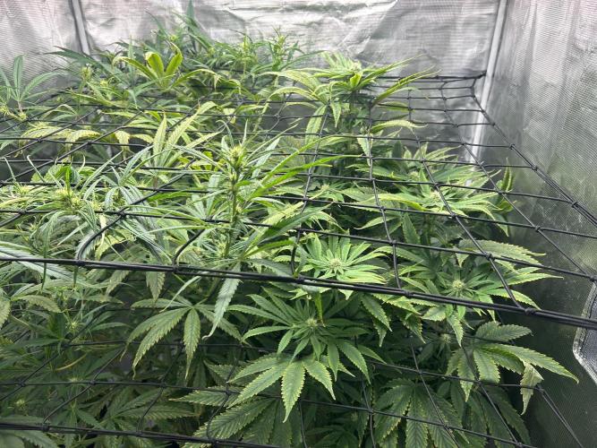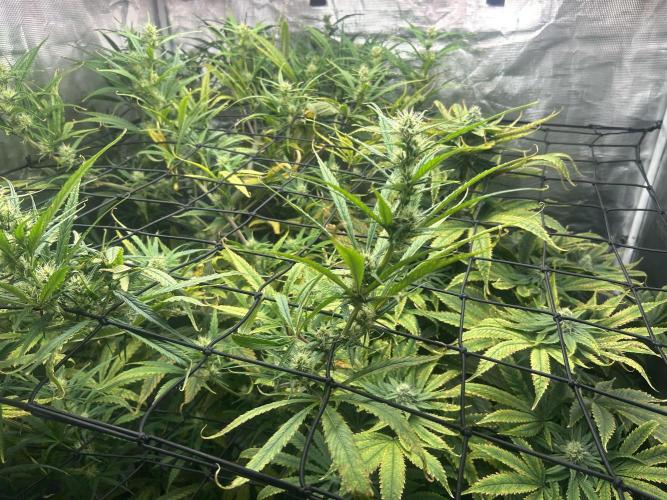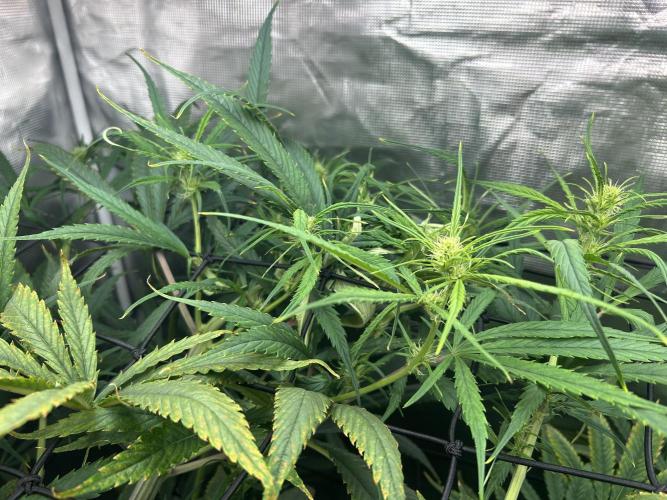MontanaManMedical She’s STILL stretching! Even the lowest branches are peeking through the 2nd net. Nutrient levels seem to be within range despite the stretch. It looks like the N level is enough. Saturday will mark 4 weeks since the switch to 12/12, so I imagine the stretch is almost finished. I pinched the tops of some of the branches to help slow them down. You can see the Girl Scout Crack she shares the tent with. No way to hide it. That plant looks healthy as well.