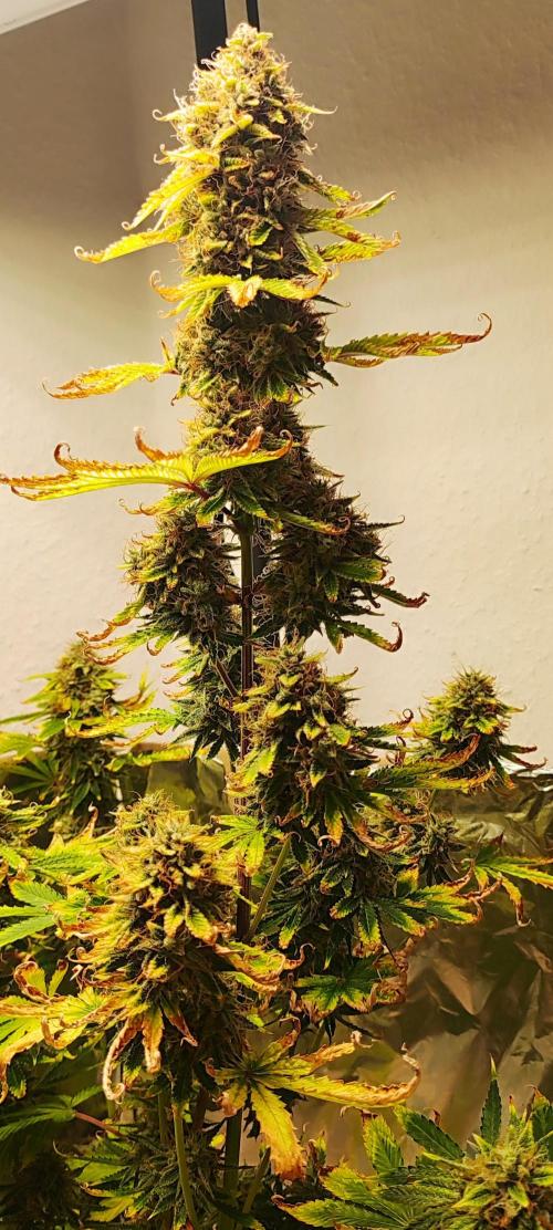 She's still growing in height like crazy, thats why she's already got some burn marks on the top leaves. The perfect example of Icarus flying too close to the sun! Apart from that, she's doing fine, developing buds, that grow bigger everyday. A few signs of nutrient deficiency are visible, but nothing to worry about, as we adjusted the nutrient intake a bit further. We're still hoping, that she won't grow in height anymore, otherwise she would end up directly inside our lamp.