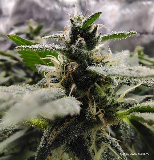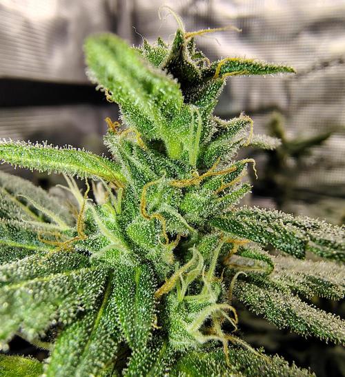 She is doing good and unmistakably into flower. I've moved nutrient ratios into bloom and she's showing no sign of burn or distress from it. Leaves are filling up with trichomes and getting sticky. The smell in the tent is quite delicious, a candy aroma of cherry blasters and citrus, with a mild skunky undertone. I can see why this 2.0 gets rave reviews from growers.