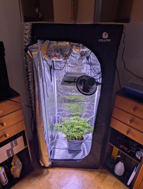 PS: Unter der Woche scheint ich das Mädchen weiter gut zu erholen, sehr schön! Luftfeuchte bleibt konstant deutlich unter 60%. LED-Abstand auf 70cm erhöht (mit Reflektion von den Zeltwänden scheint so mehr Licht unten anzukommen).