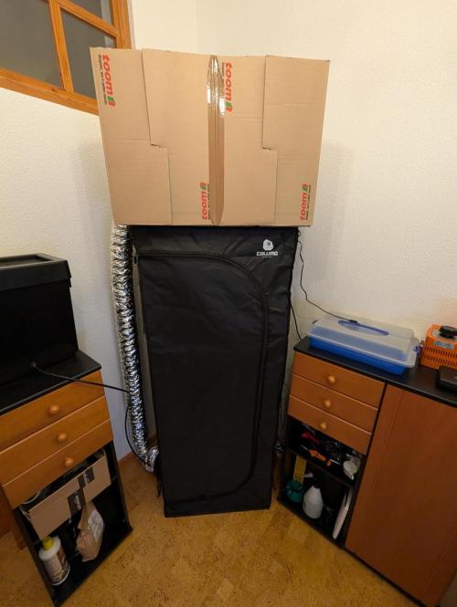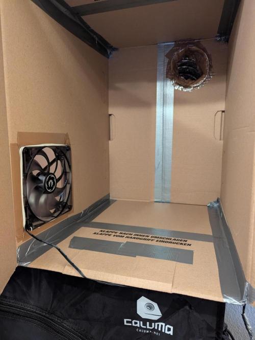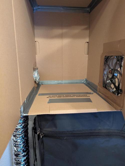 -Test 2x Umzugs-Boxen (leer) als geschlossenes System oberhalb Grow-Zelt angebunden (je 1x 10cm Einlass/Auslass, Austausch zwischen Boxen 1x 16cm Lüfter@5Volt) ergab ca. 24°C/70% rel. Luftfeuchte, kommt also für Trocknung unter keinen Umständen in Frage