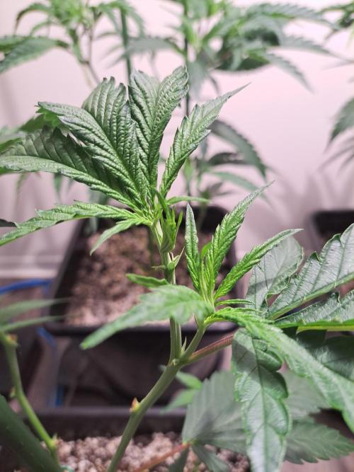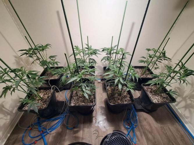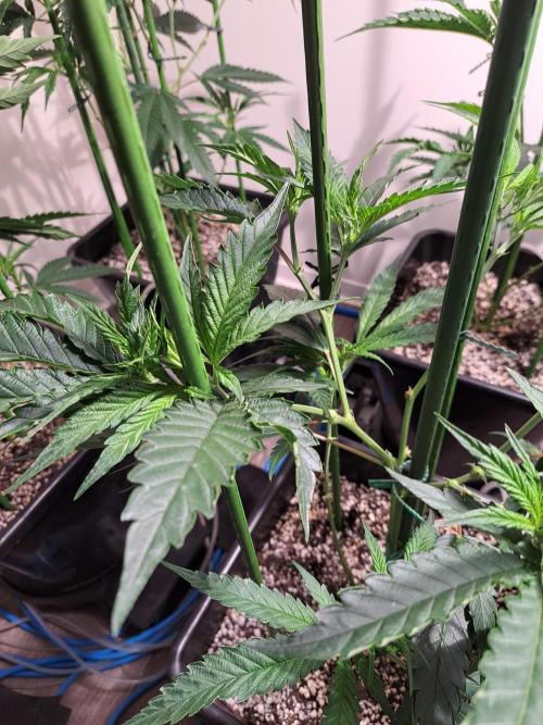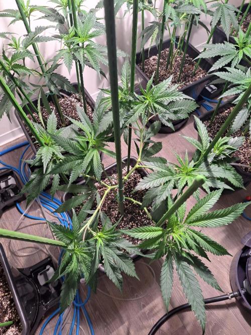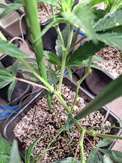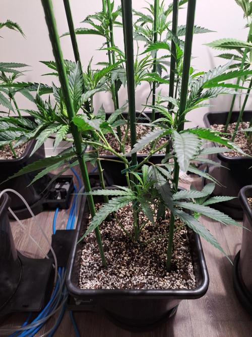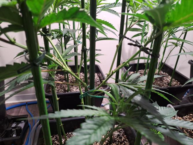 🔷 DAY57 : I placed four additional sticks in the pot and bent the five highest branches toward the sticks. With this LST technique and daily bending the branches, I hope to make the plant grow wider 😋