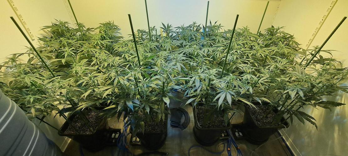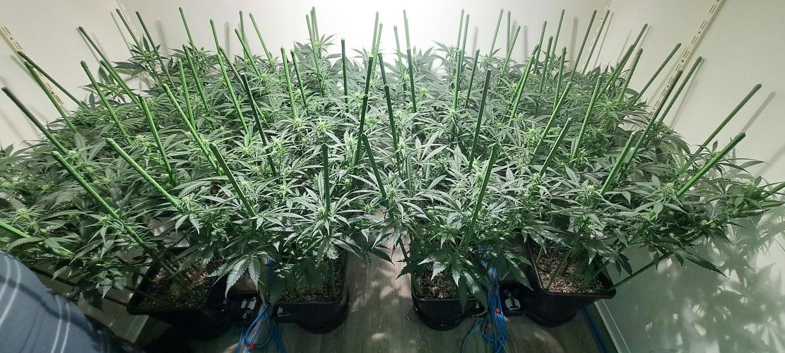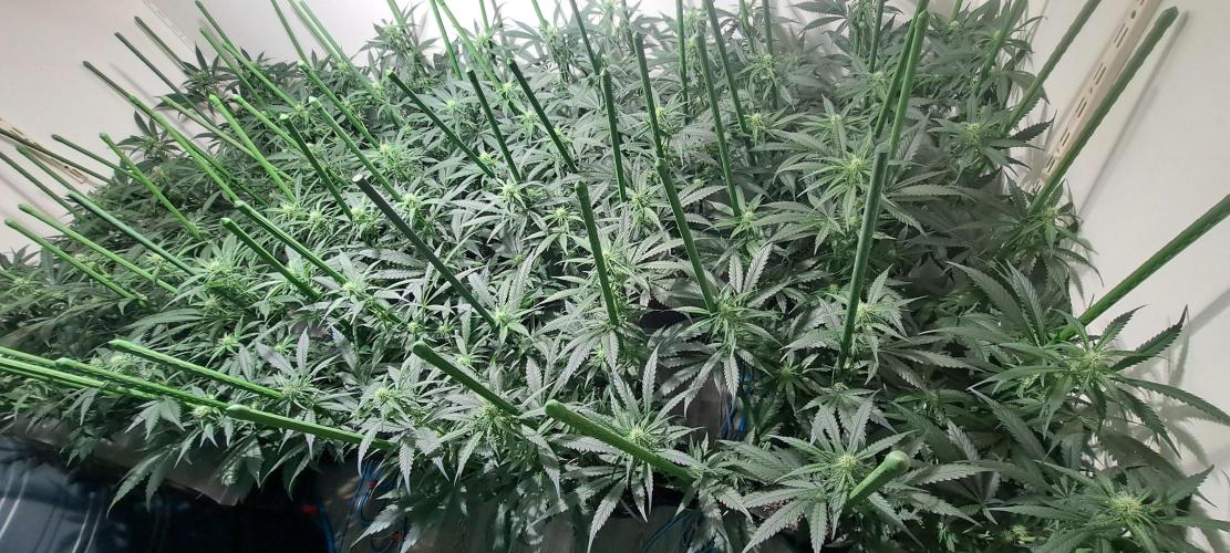 🔷 I added extra support sticks. By bending the highest branches downwards every day (daily routine) and attaching them to the support sticks, the plants become wider and wider. Because I only have 4 plants per 600 watt lamp, it is important that they grow wide. The ceiling is about 2,10 meters, so I can't let them get too big either.