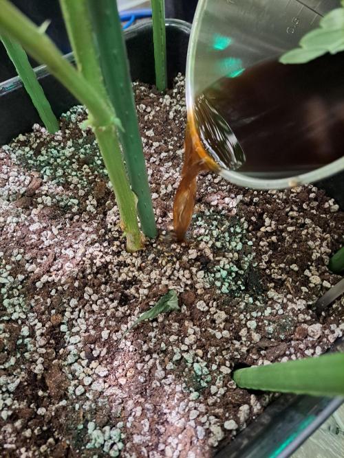 After transplanting I watered the 8 plants with 1 liter per plant. Each liter enriched with 1 gram Bactrex and 10 ml Orgatrex (see 📷 photo 4)