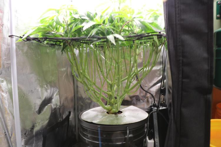 Day 25: Topped plant. Cut main stem just above 5th node. Cutting about 3-4 in high. Transplanted cutting in water with root hormote as an experiment to see if possible to clone cutting (just for fun) (see picture of cutting in pot).