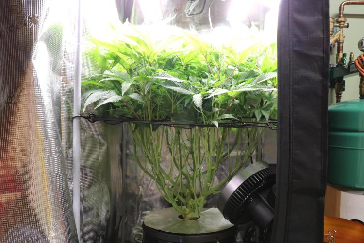 Added water to set level 1/2" *above* bottom of net basket to encourage roots to grow into note bath. Oscillating circulation fan aimed at plant on speed of 4. Direction alternates between on plant and off.