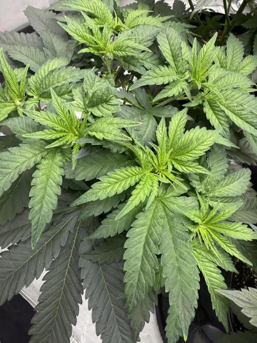 Grower_Tom Day 28: girls are doing wonderful. One has a fine line on pH and has to be pretty precise on 6.4 to balance the CalMag vs iron. I’m finding 6.5 and she goes low on iron and at 6.3 she shows signs of mag deficiency. I’m only 10 days after transplant in living soil, so it’s pretty easy to see where the problem was. I know there’s nutrients there, they just weren’t being made available. Maybe there was more to it, but dialing in the pH has seem to stop the problem. So far no defoliation needed, just simple leaf tucking and I’m able to show the tops of each node. I wish plants 2-3-4 all were built like plant one. The structure is so amazing, her “sucker branches” caught up to the top and is growing in perfect form, not too many fan leaves, not over huge, water retention is great, she never stopped growing through transplant and topping. I can’t wait to see her get flipped. If only I had another tent for a mom.